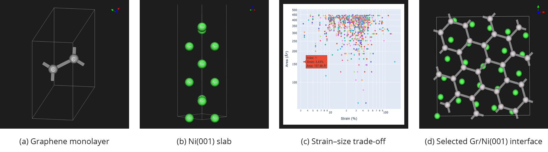 Graphene/Ni(001) interface construction workflow: (a) starting graphene monolayer film, (b) Ni(001) slab substrate, (c) ZSL analyzer output showing the strain–size trade-off for candidate configurations, where each point represents a commensurate match ranked by strain percentage and interface area, and (d) the selected interface structure with commensurate matching applied. The workflow follows a define–refine–build logic: define the film and substrate slabs, refine by enumerating and ranking possible matches, and then build the selected configuration with recorded metadata.