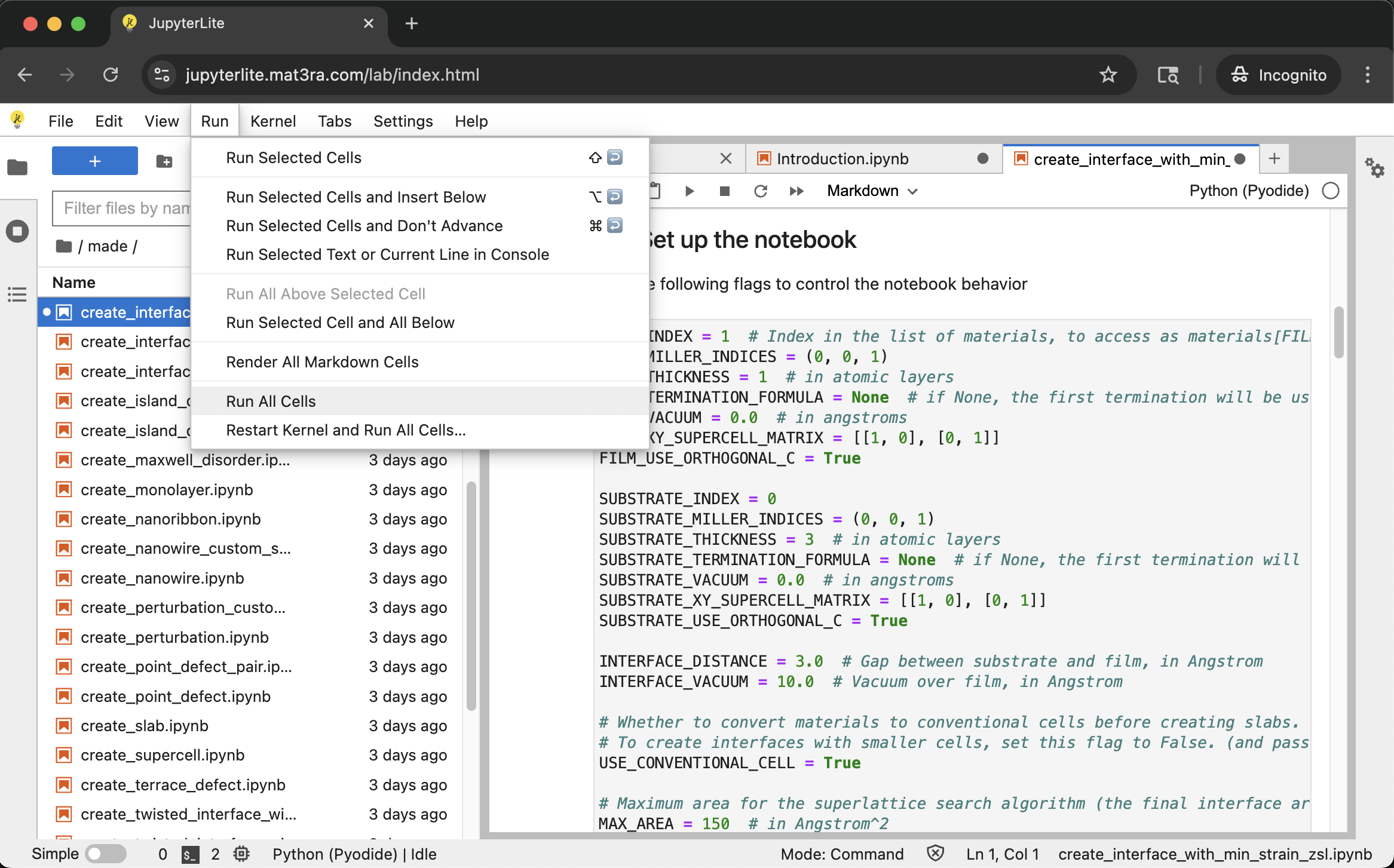 The framework combines well-defined standards for storing and exchanging materials data with modular transformation workflows expressed as configuration-builder pipelines that preserve provenance and metadata. The authors also describe reusable Jupyter Notebook implementations for common structure-generation tasks such as orientation-specific slab construction and strain-matching interface design, allowing these workflows to serve both as interactive documentation and as templates for reproducible runs.